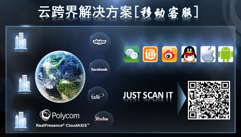 中国普罗大众的金融业务需求,如何才能尽量满足?Polycom独特的云跨界平台为金融行业的客服进行全面提升!用户只需要扫描二维码,即可进入金融虚拟会议室,轻松获得专业的金融客户服务。而金融机构内部召开视频会议也更加简单便捷,从微信、Skype、Facebook到GoogleTalk多个社交应用的联系人都可加入会议,从内到外保证通信安全,会议想开就开。