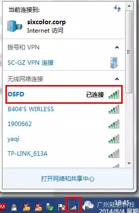 1、在Windows7任务栏通知区,点击无线网络图标,滑出当前无线连接的菜单来——