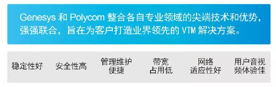 作为全球音视频领域的领导者,Polycom和全球联络中心服务解决方案提供商Genesys强强联手推出“捷宝通”,整合了在各自专业领域的先进功能和优势,共同推出业界最佳视频和路由组合的VTM柜员机解决方案(捷宝通)。银行可以在VTM机上提供7*24小时的可视自助服务,让客户与VTM的远程呼叫中心充分互动,“未来银行”的诞生指日可待!