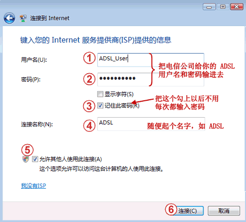 5 把电信公司给你的 ADSL 用户名和密码输进去,把记住此密码勾上,帮这个连接取个名字,把允许其他人使用此连接勾上, 然后点连接。